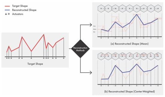 In the proposed SCD, it is necessary to calculate the length of each actuator in real time because their positions are fixed. This process adjusts the length of the fixed bars, as shown on the right side of Figure 4, to approximate the target shape. At this time, the target shape of the fixed bar is measured, and the length of the target shape is determined using information from the neighboring vertices. If we divide the area of one actuator into three dimensions, we can calculate the area, similar to the hexagons observed in the reconstructed shape in Figure 4, and determine the length of the actuator using the vertex value for this area. We also tested a method of using the mean of all vertices as the vertex information (Figure 4a) and the center-weight method of assigning higher weights to nearby vertices at the corresponding positions (Figure 4b). The center-weight is set to be proportional to the angle between the directions of the actuator and each vertex, from zero to the boundary of the hexagon.