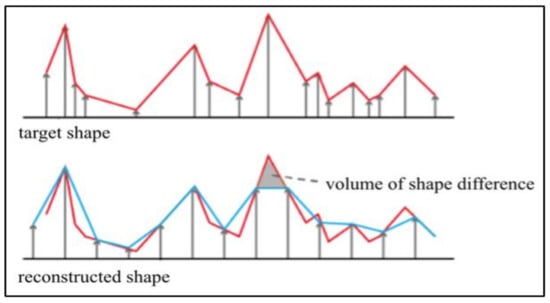 To optimize shape reconstruction, the volume difference between the two models was measured to assess the similarity of the reconstructed model with the target shape. The symmetric difference between each model was calculated to compare the volume differences between the target and reconstructed models. For example, in the case of target models A and B, the value of volume (A-B) + volume (B-A) represents the shape difference. As shown in Figure 6, when the target model A (red line) is converted to the reconstructed model B (blue line) by adjusting the bar at a fixed position, a shape difference area (gray) is formed. These lines represent the surfaces of the 3D model, and the orange area denotes the volumetric shape difference.