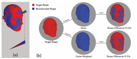 In the second experiment, seven objects were reconstructed with an 8V icosphere and compared to the ground truth digital models based on the shape difference calculation presented in Section 3.2. As shown in Table 3, the seven objects were reconstructed with the following five different center-positioning methods: (1) mean, (2) center-weight, (3–4) center positioning (fewer and more iterations), and (5) additional weight. The center-weight method appeared to afford sharp-pointed, high-resolution shapes, despite being viewed with the naked eye. To evaluate this more quantitatively, the shape difference for each model was calculated by dividing the volume difference with the target shape volume and displaying it below each reconstructed image. A negligible difference was observed between the models; however, the model reconstructed using the center-weight method had significantly fewer shape differences than those reconstructed using the mean-based 3D reconstruction method (paired t test: M = −0.042; t = −6.095; p < 0.001).