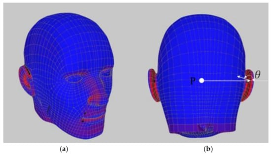 To optimize the position of the actuators, a measurement criterion needs to be defined. Considering the spherical model as an example, the normal vector of all surfaces has the same orientation as the direction vector from the center point to each surface, and it can form a near-perfect surface, assuming that the resolution of the icosphere can be increased infinitely. However, the larger the angle between the normal and direction vectors, the more difficult it is to maintain the resolution. For a surface with an angle greater than 90°, despite using a high-resolution icosphere model, the surface cannot be reconstructed. For example, the center point P (x, y, z) in Figure 8 has an angle greater than 90° with the normal vector (point behind the right ear). This demonstrates that the angle is difficult to express in the rear part of the ears, nose, and the vicinity of the mouth.