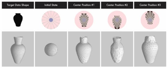The results of the center-positioning algorithm demonstrate that expressiveness can be changed by implementing visual significance. The visual significance of an object’s recognition can influence the expressiveness of the SCD. Better expressive quality can be achieved by providing visually significant features of the objects for additional weight-centering methods. For example, facial components, such as the nose, eyes, and lips, can be more significant expressors of the face than its overall shape. In this case, the proposed center-positioning algorithm moved the center points slightly closer to the visually significant features, using the method indicated in Section 3.2.2, to refine the density of the actuating vertices. As shown in Figure 15, the actuating vertex density on the surface varied depending on the location of the center position. The advantage of the dense actuating vertex is its robust SCD expressiveness of complicated surfaces, such as with the Sydney Opera House. By adding additional weights to the sail of the opera house, the center position changed and thus, the concave shape was better represented (Figure 15). In the face model presented in Table 3, the shapes of the nose and mouth in the additional weight results are clearer than those in the center-weight results. Because the center-positioning algorithm provides an optimization process for surface expressions, the shape difference can be increased. When the value of the model and the gradient function after the first iteration showing the largest change is sufficiently small (the maximum vertex length is 1/200), λ (step size) is 0.1, and all six models, except for the uneven cube, are created within 8–12 iterations. The bumpy cube model is symmetric; therefore, its position does not change, even when the center-positioning algorithm is rotated.