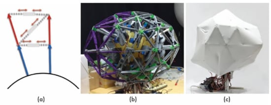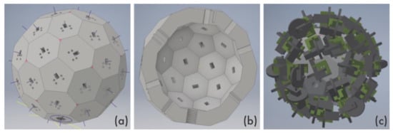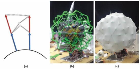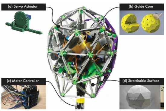 The SCD is based on a geodesic spherical shape and is constructed such that each actuator can be arranged radially along the vertices of a 2V icosphere. To manufacture its components precisely, it is modeled using 3ds Max, as shown in Figure 14b, and the core (18 cm in diameter) is manufactured with a 3D printer (3D Systems—ProX800).