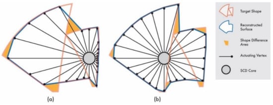 The method of dividing the area is based on the shape corresponding to each side of the icosphere. In Figure 7a, the target shape and reconstructed shape are intersected using the constructive solid geometry technique. The two generated volumes are shown in Figure 7b, and the difference between the two models can be calculated from the sum of the absolute values of the differences in the volumes of the corresponding models. We proposed a method to optimize the center position of the reconstructed model to ensure that more complex bends can be represented in the model, or alternatively, more actuating pins can be placed in the parts that need to be expressed more precisely.