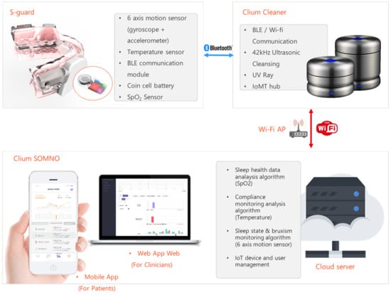 In the server, a sleep health data analysis algorithm is loaded to analyze the SpO2 data. A compliance monitoring analysis algorithm was conducted based on temperature sensing data. The sleep state monitoring algorithm analyzes data obtained from six-axis motion sensors (accelerometer and gyroscope). The bruxism status can be additionally analyzed using this function. Servers also manage connected IoT devices and users. The specific design and development features of the sensible intraoral appliance, s-Guard, are explained in Section 3.2.