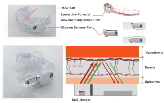 Figure 5 shows the actual slide-on prototype model of the s-Guard. The MAD part was adjusted to fit the individual patient/user through a dental prescription. The lower jaw forward movement adjustment part provides the patient/user breathing space. All sensors and modules were embedded in the slide-on sensory parts. This part can be attached and detached to replace the power supply battery. SpO2 is sensed through our solution by reflecting the data obtained from the vein and artery in the dermis part of the gums.