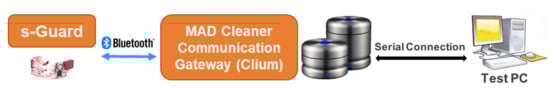 Healthcare data sensed from s-Guard are then transmitted to the MAD cleaner (named Clium) via Bluetooth communication. This is because the Bluetooth protocol is a form of near-field communication (NFC) [], which basically needs a form of gateway to fully communicate with a server for full-service launch.