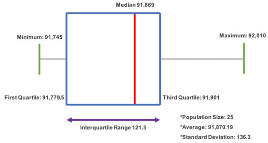 The transmission speed results obtained from volunteer test patients are shown in Figure 8. The test environment was conducted according to the specifications mentioned in Section 3.2. All test procedures were approved by the Institutional Review Board (IRB) of Yonsei Severance Hospital (IRB approval number 2-2019-0060). Starting from a set time (time stamp = 0), the transmission speed was measured 26 times (n = 26) with a time interval of 2 s. All results were rounded up to the second decimal place. The results showed an average transmission speed of 91,870.19 bytes per second (standard deviation 136.3), with a population size of 25. The minimum value was 91,745, and the maximum value was 92,010, with a median of 91,869. The first quartile was 91,779.5, and the third quartile was 91,901, with the interquartile range of 121.5.