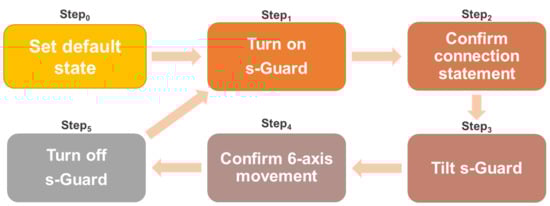 First, s-Guard was set to a default state (Step0). It was switched from off to on (Step1), which was the start of the first cycle. When pairing is complete, confirm the fixed connection statement “Now connected to the BLE Server” from the screen shown on the test computer (Step2). Then, the tilt s-Guard is used to check the sensing connection (Step3) and then check the screen that shows the six-axis values from the test computer again (Step4). Here, six-axis values refer to combinations of values (2 × 3) calculated from the accelerometer (two-dimensional data) multiplied with gyroscope (x, y, z three-dimensional data). Finally, the s-Guard (Step5) completes one cycle, and the next cycle begins. When the final Step5 is completed, complete Cn and start another cycle. The final results indicated a success rate of 100%, as shown in Table 4.