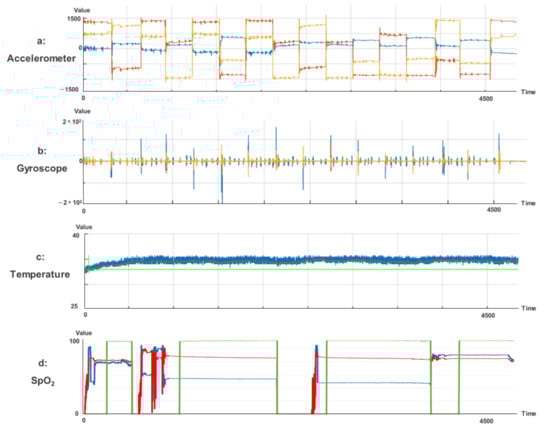 Accordingly, actual physiological signals of six-axis sensors (accelerometer and gyroscope) are shown in Figure 10. Figure 10a,b shows the accelerometer raw data and gyroscope data acquired by time. Each of the three colors of red, yellow, and blue in Figure 10a indicate x1, y2, and z2 three-dimensional axes, respectively. On the other hand, each of the two colors of yellow and blue indicate x2 and y2 two-dimensional axes, respectively. Figure 10c shows the temperature data acquired by s-Guard. The blue line indicates raw data, the red line indicates linear average, and the green line indicates temperature critical level threshold. Lastly, Figure 10d shows raw data acquired from the SpO2 sensor from s-Guard. The green, red, and blue lines refer to SpO2 raw data, heart rate, and infrared raw data, respectively.