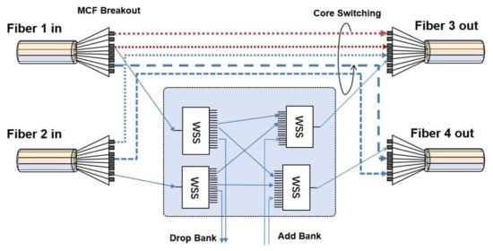 - Liu, L.; Yan, S.; Maguire, G.Q.; Li, Y.; Simeonidou, D. Hardware-Efficient ROADM Design with Fiber-Core Bypassing for WDM/SDM Networks. In Proceedings of the 2020 Optical Fiber Communications Conference and Exhibition (OFC), San Diego, CA, USA, 8–12 March 2020. [Google Scholar]