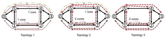 In Figure 3, the three different virtual topologies come from using different cores to set up the bypass connection. Topology 1 shows that one core is used for one-hop pair nodes with one core for two-hop pair node bypass connection, while topology 2 presents two cores that are used for one-hop pair-nodes and one core is used for two-hop pair nodes. As for topology 3, only two cores are used for one-hop pair nodes bypass connection.