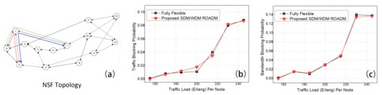 Figure 5 shows the NSF topology and the results of blocking probability in NSF topology network by comparing between fully-flexible setup and the proposed setup with bypass configurations. In both traffic and bandwidth blocking probability as shown in Figure 5b,c, the proposed solution shows similar performance as the fully flexible setup.