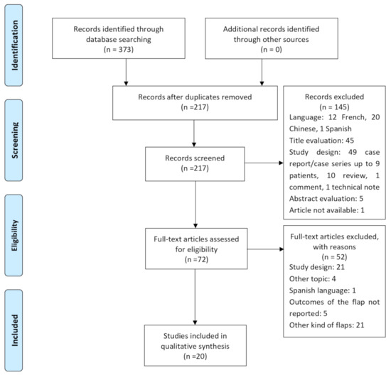 The PubMed and Cochrane Library database search identified 373 articles: 156 were duplicate articles, while 217 studies were screened for title, abstract and language. Seventy-two full-text articles were finally selected for further evaluation. Of the 72 papers, 49 were excluded: 4 case reports, 13 case series with fewer than 10 patients, 3 letters, 1 review article, 1 paper in Spanish language, 21 papers reporting other kinds of flap than FAMM or i-FAMM, 5 papers not reporting flap viability outcomes and 4 papers not meeting the inclusion criteria. The selection process identified 20 articles as eligible for inclusion in the review: 12 retrospective studies, 5 case series and 3 case-control studies (Figure 1).