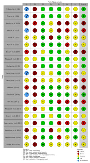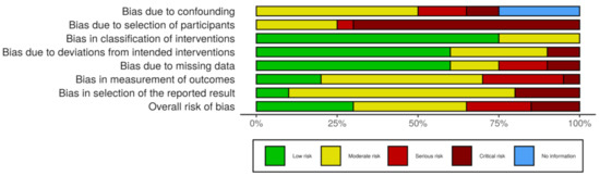 - Sterne, J.A.; Hernan, M.A.; Reeves, B.C.; Savovic, J.; Berkman, N.D.; Viswanathan, M.; Henry, D.; Altman, D.G.; Ansari, M.T.; Boutron, I.; et al. ROBINS-I: A tool for assessing risk of bias in non-randomised studies of interventions. BMJ 2016, 355, i4919. [Google Scholar] [CrossRef]