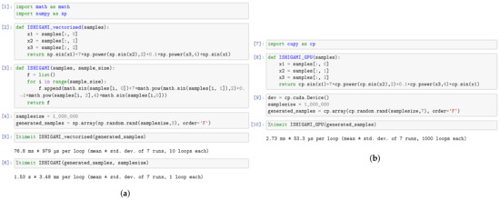 Due to the drastic performance increase, NumPy Array programming has become the standard within the Python community, especially in the context of scientific computing. According to [13], NumPy played an important role in the software stack that led to the discovery of gravitational waves. For additional information on NumPy, see [14,15]. Another external open source Python library used in this paper is the CuPy library [16]. It can be implemented as a drop-in replacement for the NumPy library to execute computations on the GPU without having to apply NVIDIA’s CUDA programming syntax (see Figure 1b).