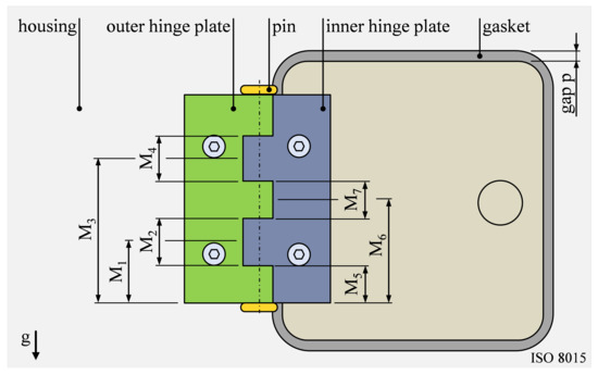 The hinge consists of two main parts (the outer and inner hinge plates) connected by a pin. The hinge enables the opening and closing of a cover plate. Due to manufacturing deviations of the dimensions to , a variation of the vertical position of the cover results. These deviations are limited by the tolerances specified in Table 2. The tolerances follow a Gaussian or a uniform distribution. In order to ensure a sufficient sealing gap, the standard deviation of the gap p should not exceed the limit of 0.1 mm. Hence, the functionally relevant key characteristic of the assembly is the vertical displacement of the inner hinge plate with respect to the outer hinge plate, which directly influences the width p of the gap for the gasket.