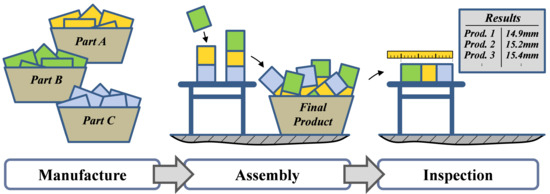 The application of Monte Carlo simulation [29] in statistical tolerance analysis carries out a virtual reproduction of the manufacturing, assembly and inspection of a large number of products. Figure 4 illustrates these three steps. First, a defined number n of variants of each individual part are generated virtually, which differ from each other in various properties (e.g., dimensions), which are subject to tolerances [30]. The value of this deviation is determined taking into account the associated probability distribution of each tolerance. This step reproduces virtually the production of n single parts. In the next step, the single parts generated are assembled into n final products. This corresponds to the n-fold virtual assembly of the final product and is based on the “pulling without adding back” of the individual parts according to Bernoulli’s urn model [31]. Finally, the relevant key characteristic is determined using the vector-chain and documented for each of the n virtually assembled products. This corresponds to the inspection of the products after their assembly.