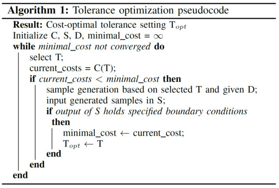 The purpose of statistical tolerance synthesis is to allocate the maximum tolerance of the functional key characteristic to the characteristics of the parts of the product [9]. It is thus the inverse or inversion of statistical tolerance analysis [9]. The goal of statistical tolerance synthesis is to identify the best compromise between (usually two) divergent requirements for a product and thus for tolerating the individual part. In the case of a cost-driven statical tolerance synthesis, this compromise is the tolerance that is associated with the lowest manufacturing costs, but at the same time ensures that a defined rejection rate of the final product is not exceeded [9]. If this compromise is identified by means of numerical optimization, the phrase statistical tolerance optimization has become established. Pseudocode for the implementation of a cost-driven statistical tolerance optimization algorithm is provided in Figure 5. Let T be a selected set of tolerances, which is chosen by a global optimization solver. The cost function is denoted by C. The total production cost is the sum of the production costs of each tolerance on the basis of the tolerance cost model.