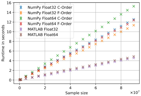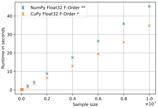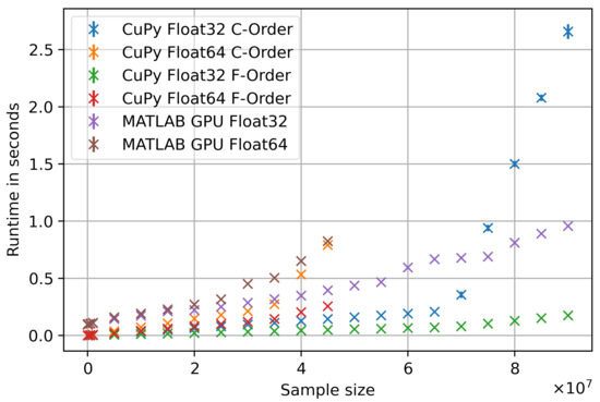 Since, for the GPU implementations, the generation and processing of the random numbers does not take place in the workstation’s memory, but in the typically smaller video memory of the GPU, some distinctive results can be observed compared to the CPU implementations: (i) The video memory of the GPU in use reaches its capacity limit for double precision floating-point numbers for sample sizes larger than (NaN results in Table 8). With single precision, which only requires half as much memory as double precision floating-point numbers, the memory limit is reached at sample sizes greater than . (ii) The choice between single and double precision also has a greater influence on the runtime, which is significantly lower in the case of single precision compared to using double precision. (iii) As in the case of CPU implementation, the use of the F-order storage layout seems to be more advantageous for the implementations. On the one hand, the runtime is consistently lower, and on the other, the GPU implementations with C-order storage layout exhibit runtime spikes for higher sample sizes. We see the cause in the less efficient memory access operations compared to the implementations using the F-Order storage layout. (iv) In contrast to the CPU implementations, the GPU Python implementations perform significantly better than the GPU implementations with MATLAB.