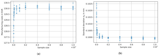 Figure 9a displays the manufacturing costs calculated by the statistical tolerance synthesis (with CuPy Float 32 F-Order) vs. the sample size, from Section 6.2.1. Figure 9b displays, on the basis of a sample size of , the corresponding standard deviation , in order to determine if a sample size of 10,000 is sufficient for the tolerance optimization problem.