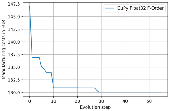 The spread of the results of the statistical tolerance syntheses in Figure 9a,b show that for the given tolerance problem, a sample size of at least 50,000 samples should be used to satisfy the boundary condition ( mm) with sufficient confidence. Smaller sample sizes tend to result in manufacturing costs, and thus tolerances, that do not comply with the required boundary conditions of the statistical tolerance synthesis. On this basis, computation using the GPU is preferable due to its lower runtime for the differential evolution. Figure 10 illustrates the reduction of manufacturing costs during optimization. The optimization is carried out using the parameter settings shown in Table 5 and a sample size of 100,000 with the CuPy single precision Float F-Order implementation. Hence, a cost-optimal tolerance specification is obtained after 55 steps of the evolution (approximately 13.5 s).