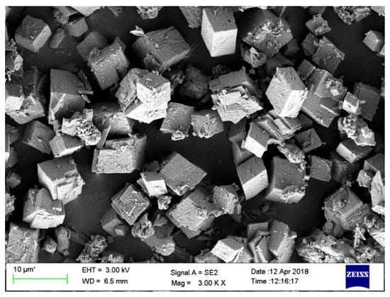 Field emission scanning electron micrograph (FESEM) of the calcite phase of calcium carbonate microparticles from incense sticks ash.