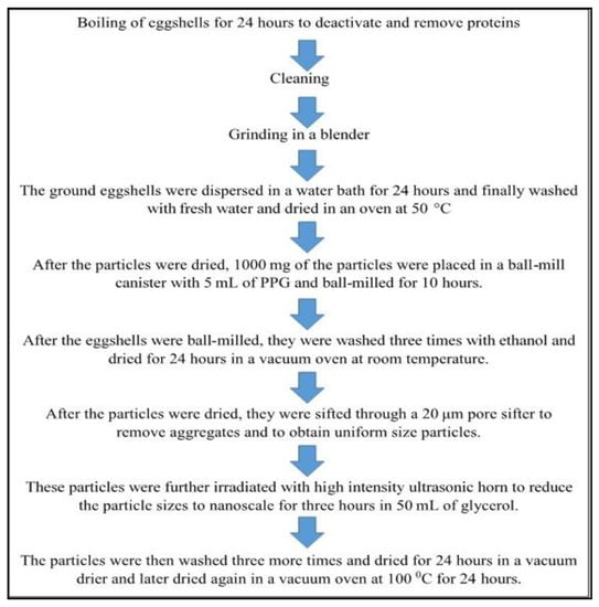 Hassan et al. (2013) reported the synthesis of CCPs from the chicken eggshell waste, which encompasses the following steps cleaning and size reduction of eggshell, followed by surface modification by the sonochemical method for enhanced dispersion [48,49]. Hariharan et al. (2014) reported the successful synthesis of calcite NPs from eggshell waste using gelatin [50,51]. The calcite polymorph of CaCO3 was synthesized using from chicken eggshells employing gelatin via precipitation method and the confirmation of the nano calcite was done by X-ray powder diffraction (XRD), Fourier-transform infrared spectroscopy (FTIR), UV–Visible (UV–Vis) spectroscopy and scanning electron microscopy (SEM). The identified particles were calcite polymorphs with a particle size of 25 nm. The analysis results confirmed the formation of calcite NPs and the obtained results were compared with CaCO3 synthesis without using gelatin. Render et al. (2016) reported the synthesis of CCPs by using eggshell waste that has been used for enteric drug delivery. The sequential steps involved in the synthesis of CCPs from eggshell was initial cleaning, mechanochemical milling, and Sonochemical irradiation [52]. Pandita and Fulekar in 2017 and 2019 reported the synthesis of CCPs from eggshell waste [53]. The investigators, have reported the synthesis of micron and nano sized CaCO3 and further transformed them into the CaO NPs by calcination at 900 °C for 4 h. They used these CaO NPs for increasing the efficiency of biodiesel by as micronutrient for the algae the microalgae. Further, Ahmad et al. (2020) has synthesized nano calcium oxide from the eggshell waste and utilized them for the direct transesterification of Chlorella pyrenoidosa. The eggshell was washed properly, crushed by mortar pestle, dried at 105 °C, and calcined at 870 °C for three hours. The final powder was analyzed by the sophisticated instruments, for their morphological properties. The size of CCPs was varying from 25 to 100 nm. Further they have used these nano CaO successfully up to six cycles for the transesterification [54]. Figure 3 demonstrates the flowchart of synthesis of CaCO3 from egg shells.