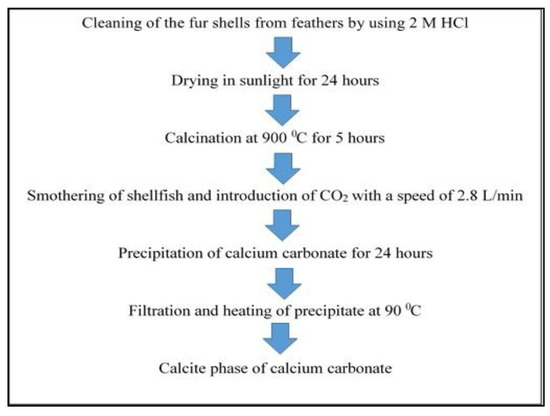 Dolomites [CaMg(CO3)2] are anhydrous carbonate minerals of calcium and magnesium carbonate [66]. It is widely used in the steel and industries. Such iron or steel based industries produces 40–70% byproducts including dolomite as waste. In general, dolomite is used for the preparation of precipitated CaCO3 by separating Ca and Mg fractions. The major problem in their separation from dolomite is that both the elements have a lower solubility in the water [67]. Some investigators have successfully used sucrose for the extraction of Ca and Mg from dolomite. When the calcinated dolomite is dissolved in a sucrose solution, then there is the conversion of CaO into calcium sucrate leaving unreacted Mg in the mixture as a precipitate [68]. When calcined dolomite (CaO.MgO) is dissolved in a sucrose solution, CaO will be converted into soluble calcium sucrate, while MgO remains unreacted and presents in the precipitated form [69]. Figure 7 illustrations the stepwise synthesis of CCPs from dolomite.