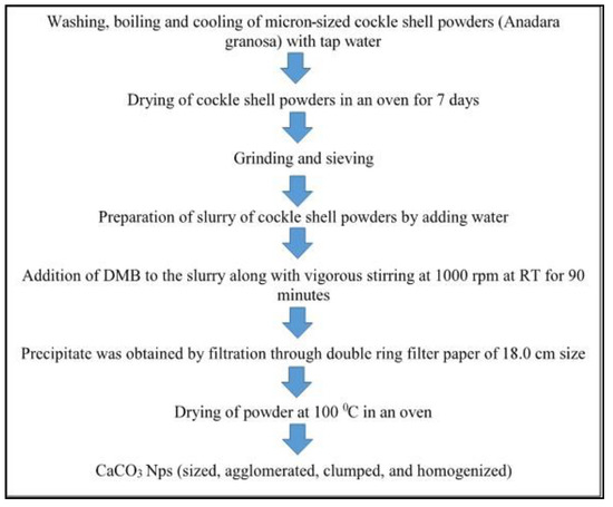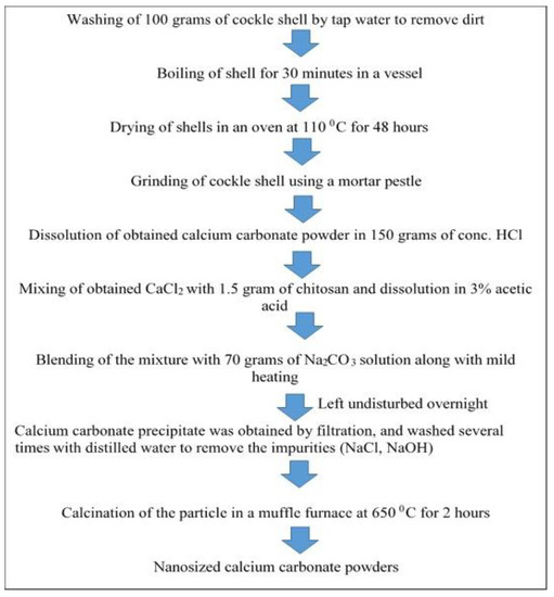 Majusha Hariharan et al. (2014) synthesized and characterized the nano calcite through the precipitation method from the cockle shells using chitosan as precursor materials. The schematic steps involved in the synthesis of CCNPs from cockle shell are given below in Figure 5. The nano calcite was characterized by SEM, XRD, UV–Vis, and FTIR for confirmation of the particles which was later on compared with the commercial nano calcite. It was found that cockle shells are a potential source of nano calcite, which was by-products of the seafood industry so the method was cheaper and environment-friendly [50].