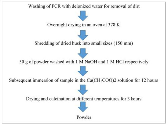 About two-thirds of the world’s citrus fruits are produced by Brazil, China, India, Mexico, Spain, and the USA. In 2016, about 124 Million gallons of citrus fruits were produced out of which 50–60% used as fresh fruits while the remaining 40–50% was subjected to industrial processing for extraction of juices, etc. Based on the applied technology and type of cultivars, the citrus peel waste of such industries varies from 50 to 70% w/w of processed fruits [79,80]. This leads to the generation of 10 Mg of citrus peel waste, which has moisture whereby it attracts flies, insects, and mosquitoes and leads to the pollution. So, it is important to process the citrus peel waste for the recovery of value added materials. One such citrus fruit is finger citrons (FG) whose shape is unusual and the fruit is segmented into finger-like sections [81]. Finger citron, which is a subtropical plant, is grown in China’s Sichuan, Fujian, Guangdong, and Zhejiang provinces [82]. In the time of finger citron beverage processing, a huge amount of Finger citron residues (FCRs) are produced which is disposed of as garbage Such disposals sometimes may give rise to other environmental problems [83]. It has a porous texture and contains numerous organic compounds which makes them a preferable precursor material for the synthesis of porous materials that can also be potentially applied for environmental protection. They are almost similar to lemon and used as a substitute for lemon in China. FCR is the residual of the fruit after extraction of juices from it. The FCR is reported to have numerous valuable minerals and elements but it has a high amount of Ca which makes them a suitable material for the extraction of CCPs. The synthesis mechanism of CC NPs from FCR is given below in Figure 9.