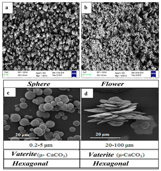 Similarly, Raman spectroscopy also helps in the identification of molecules and functional group identification. The most important technique is the SEM which helps in the differentiation among the three polymorphs of CCNPs otherwise all these three polymorphs will look alike. The TEM also helps in the size determination of the particles. Based on the external morphology these polymorphs can be easily recognized as nano calcite. They are rhombohedral in shape, aragonite is needle-shaped and the vaterite is either spherical or flower shape. The typical field emission scanning electron microscope images of nano calcite, aragonite, and vaterite are shown in Figure 11a–d. The rhombohedral shaped particles confirm the calcite phases whose surface is smooth with sharp edges and corners [88].