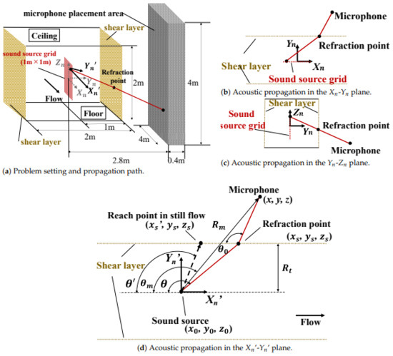 As mentioned in the problem setting of the present study, we consider the propagation time and attenuation rate from one microphone to grid points in the sound source localization area. The propagation path from the microphone to the source grid is equivalent, even if the sound source and microphone are exchanged in their places. Thus, the propagation time and attenuation rate can be calculated by considering those of the acoustic wave that is generated from a virtual sound source located at a given grid point. Figure 2a–c show a schematic image of the propagation path when considering the acoustic wave generated from one point on the sound source grid and its refraction. The acoustic propagation actually occurs in a three-dimensional space, but the refraction can be considered to be two-dimensional because the flow velocity in the and axes inside the wind tunnel is zero and the air density does not change through the shear layer. Therefore, the refraction occurs in the plane, but not in the plane. The propagation, including refraction, can be assumed to only occur in the plane, as shown in Figure 2a. While Amiet derived the refraction correction formulas in the plane perpendicular to the shear layer [5,12], the present study simply extends this Amiet formula to outside the plane perpendicular to the shear layer with the assumption of the same sound speed inside and outside the test section as each other. An additional assumption simplifies the calculation. The deviation of the extended formula is presented, as follows.