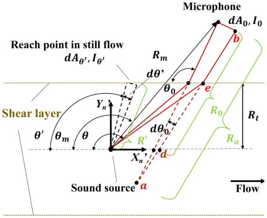 where , , and c are the positions that the sound wave reaches the shear layer without the flow velocity, the sound source position, and the sound speed, respectively. Because the sound wave is only advected in the flow direction by before reaching the shear layer, is given by Equation (5).