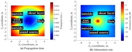 Figure 4 shows the distributions of the propagation time and the attenuation rate in the plane ( = 0) calculated using the derived equations. The position of the sound source was set to be (0, 0, 0), and the Mach number inside the wind tunnel M = 0.3 and sound speed c = 340 m/s.