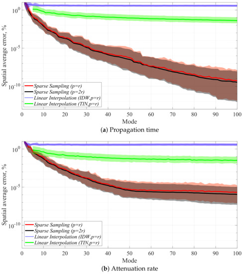 Here, is a vector of reconstructed results that correspond to the propagation time or the attenuation rate of 40,000 grid points in the source grid. In addition, is a vector of reference values for those at each test condition. The reference values can be obtained by the exhaustive calculation of the Amiet method [5] without using sparse sampling. Figure 7 shows a comparison of the estimation accuracy of the four methods. The solid line shown in Figure 7 depicts the average of 50 test cases, and the shaded region shows the error bar defined by the minimum and maximum values of them. The calculations of the TIN interpolation methods for one to four modes are not conducted because the number of sampling points that can divide into triangles is five or more in the TIN interpolation method [30].
