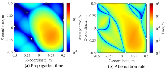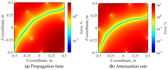 Once and are constructed, a test condition of microphone position and wind velocity from the range that is shown in Table 1 is chosen. Here, the test conditions are not included in the training data. The observation vector is constructed by calculating the propagation time or the attenuation rate of p sampling points under the test condition. Subsequently, and are quickly obtained by using Equations (27) and (29). For evaluation of the proposed method, the estimated data matrix is compared with the reference matrix, in which all of the points are exhaustively calculated by the Amiet method [5]. The reproducibility is verified by taking the relative error and calculating the average of each row.