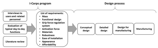 A lightweight and highly functional body-powered hook was designed as a result of the I-Corps program developed by the National Science Foundation (NSF) of the United States (Figure 1). The objective of the I-Corps methodology process is to provide developments tailored to the needs of a population. In this study, 106 interviews were conducted with users and related personnel (prosthetists, rehabilitators, sellers, administrative personnel of medical centers, and politicians) in order to identify the needs of the users from certain developing countries. In addition, how consumers typically use their prosthesis for daily activities was also analyzed. Based on the results of these analyses and a literature review, a list of requirements was defined to design a body-powered hook with a VO mechanism. The design process consists of four stages: