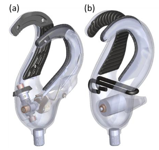 Body-powered hook technology has not evolved significantly over the last years [14,19]. A research study conducted more than two decades ago [20], reported the design priorities for body-powered technology users, and these user priorities are still present in surveys from more recent studies [1]. This lack of research and development leads to high rejection rates [6,21]. Despite the obvious need for new body-powered alternatives, only a few new developments have emerged recently, such as the “Maker hand” [22] and the “Delft cylinder hand” [23]. Both use the hand as a terminal device, which is not frequently used and has the highest rejection rate for body-powered technology [1]. In contrast, the Body-Powered Grip VC “GRIP 5” [24] has high functionality due to its VC mechanism, since the user can manipulate the pressure control. However, in daily use, the VC mechanism can cause fatigue and discomfort [13]. Contrarily to body-powered devices, there is a large variety of 3D-printed prostheses [25,26,27]. Three-dimensional printing facilitates the development process and allows a great variety of designs without the restrictions of typical manufacturing processes [28]. However, 3D-printed prostheses have not reported user acceptance, functionality, and durability [16]. Therefore, the context and needs of prosthetic users should be considered while designing prostheses [29].