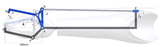 where stands for the moment that resulted in point A, while , and stand for the moments generated by the pinch, the cable, and the elastic band, respectively. Then, each moment was decomposed into its components, as in: . Where represents the distance from the applied force to the point of rotation and represents the actual force. Finally, each force was determined separately by considering one term equal to zero at a time. For , , when the cable is excursed, as shown in Equation (2):
