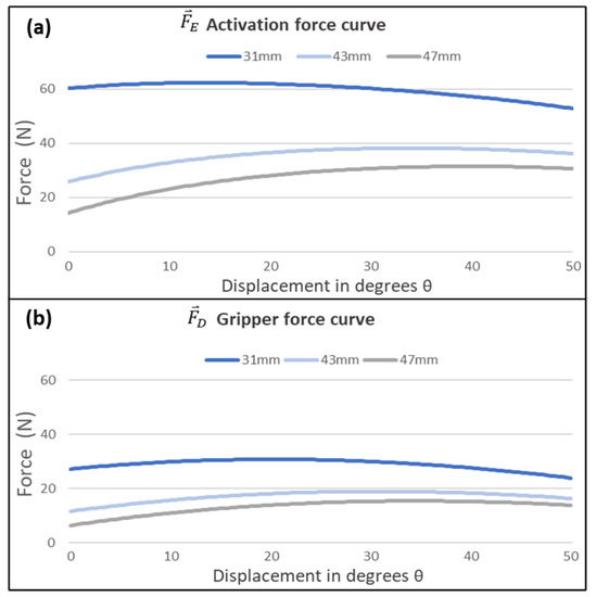The kinetic study results were validated through simulation. The values are plotted in Figure 5. The activation force presented in Figure 5a shows the magnitude of force when . Similarly, the gripper force curve presented in Figure 5b shows the magnitude of when .