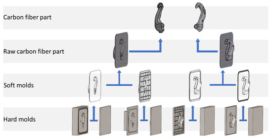 The in-house manufactured parts were slightly modified to achieve draft angles that would facilitate the manufacturing process. In areas where it was not possible to modify the negative draft angle, molds were devised to allow a smoother removal of the part. The tolerances were defined using GD&T as a result of stack up tolerances for the assembled parts. The carbon fiber parts presented in Figure 6 were created from soft molds, which, in turn, were created from hard molds by a Roland model MDX-40A CNC.