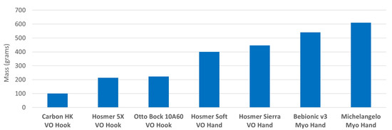 Carbon HK VO hook mass (left) compared to current state-of-the-art commercially available upper limb prosthetics.