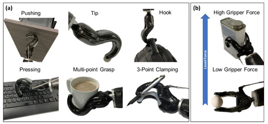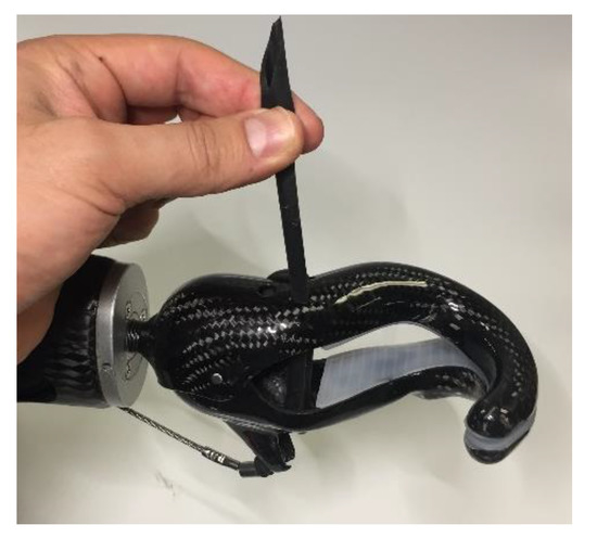 The Carbon HK VO hook developed in this study has a simple design. The hook performs basic grip and tip pinch grasp functions, which allow users to perform the highest number of daily tasks possible. The clamp has a maximum opening capacity of 84 mm, which allows the user to hold various objects, from small coins to large cups of coffee (Figure 9a). Its hook shape allows users to hold bags without activating the prosthesis; moreover, it is possible to push objects or press small buttons with the tip. The Carbon HK VO hook can also firmly hold objects with a handle using a three-point clamp, such as pens or hand tools. Finally, the user can regulate the force level as desired (Figure 9b), allowing them to hold delicate objects without breaking them or heavy objects without losing grip.