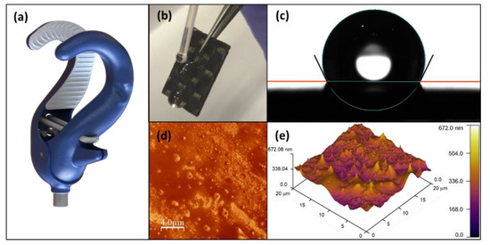Surface properties of chemically treated carbon fiber: (a) carbon fiber material (blue) covered with hydrophobic polyester resin; (b) water repellence observed by depositing droplets on the surface; (c) characteristic image of a droplet with contact angles marked; (d,e) AFM images (2D and 3D representations, respectively) of the treated carbon fiber, showing details of surface relief and roughness.
