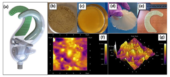 (a) Silicone rubber material with antibacterial properties (green). Pathway for obtaining the antibacterial silicone grip: (b) synthesis of nSi@AgNPs powder; (c) incorporation of nSi@AgNPs into the silicone matrix; (d) cured antibacterial silicone in the labsite; (e) antibacterial silicone grip prototype; (f) 2D, and (g) 3D AFM images of the surface of the antibacterial silicone grip prototype.