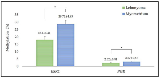 Methylation levels of ESR1 and PGR in leiomyoma and myometrium tissues. Data indicate mean ± standard deviation, and * p < 0.05.