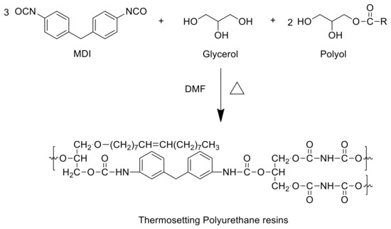 Thermosetting polyurethanes synthetic pathway (TSPUs) using pMDI, polyol, and glycerol [142].