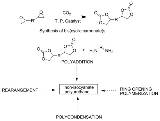- Cornille, A.; Auvergne, R.; Figovsky, O.; Boutevin, B. A Perspective Approach to Sustainable Routes for Non-Isocyanate Polyurethanes. Eur. Polym. J. 2016, 87, 535–552. [Google Scholar] [CrossRef]