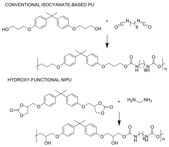 A polyaddition of bifunctional cyclic carbonates with primary di- or polyamines containing poly(hydroxy urethane)s (PHUs) with other primary or secondary hydroxyl groups in the side chain, shown in Figure 4, is the most examined and the best possible synthesis path for preparing NIPUs. Drechsel and Groszos first researched this route in 1957 [158]. The group’s hydroxyl can form inter- and intra-molecular hydrogen connections with the groups of urethane carbonyl [14,150,154,157]. The use of ecologically benign bio-based materials and carbon dioxide fixation is also a benefit of the polyaddition process. Furthermore, without catalysts and solvents, synthesis could be achieved [14]. This generates enhanced chemical resistance to organic solvents in obtained PHUs. Additionally, PHUs have increased thermal stability due to a lack of labile biurets and allophanate thermally unstable groups [159]. PHUs also benefit from the ability to react with various chemical functional groups of constituted hydroxyl groups [160]. In contrast with standard polyurethanes, literature studies show inconsistent evidence of PHU water intake during exposure to water [150,152,154]. The chemical structures of both traditional isocyanate-based and hydroxy-functional isocyanate-free polyurethanes are presented in Figure 5.