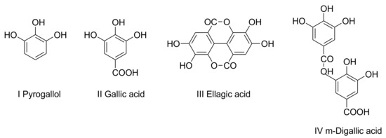 Tannins are usually graded as hydrolyzed and as condensed compounds in two major classes (polyflavonoid tannins). Hydrolyzable tannins are derivatives of gallic acid and are categorized according to products derived from their hydrolysis. They are also classified into gallotannins (comprised of gallic acid and glucose) and ellagitannins (comprised mainly of digallic and ellagic acids and penta-galloyl-glucose). They consist of various combinations, the main components of which are n-galloyl-glucose oligomers and their re-arrangement derivatives, such as vescalin and vescalagin. Pentagaloyl glucose and polyesters made of gallic acid and hexahydroxydiphene acid are the central repeating unit in the hydrolyzed tannin structure. Simple phenol structures of tannin are shown in Figure 7. The flavonoid units that have undergone different condensation degrees are composed of condensed tannin extracts (polyflavonoid). Their precursors (flavan-3-ols, flavan-3,4-diols), other flavonoid analogs, carbohydrates, and traces of amino- and imino-acids were always correlated with them [204,208]. Monoflavonoids and acids containing nitrogen are present in amounts that are much too small to affect the whole extract’s chemical and physical characteristics. Nevertheless, simple carbohydrates (hexoses, pentoses, disaccharides) and complex glucuronates (hydrocolloid gums), also oligomers obtained from hydrolyzed hemicelluloses, are commonly present in sufficient amounts. Likewise, carbohydrate chains of varying lengths are also often connected to flavonoid units in tannins. It is also well known that tannins are vulnerable to modifications by hydrolysis, polymerization, copolymerization, or acetylation to produce new materials [209]. Esmaeili et al. reported the preparation of carbonated glycidyl ethers of gallic acid and tannic acid by catalytic fixation of CO2. Cyclic carbonates obtained were cured with amines in the next step to obtain new bio-resourced NIPUs using natural polyphenolic waste [205].